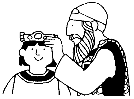 Joash was saved from Queen Athaliah, his evil grandmother, who tried to kill all the heirs to the throne so she could be queen. When she died, Joash was crowned king. He was only seven years old at the time and was the youngest king. Color the picture of Joash being crowned as king of Judah.